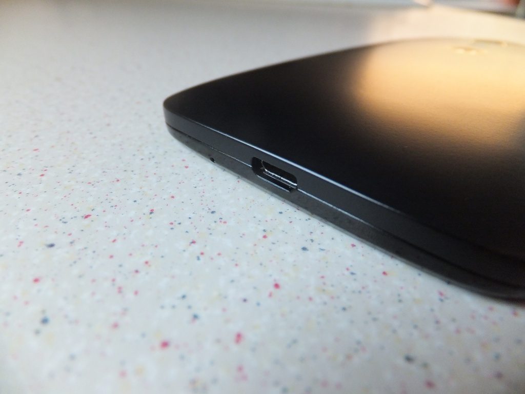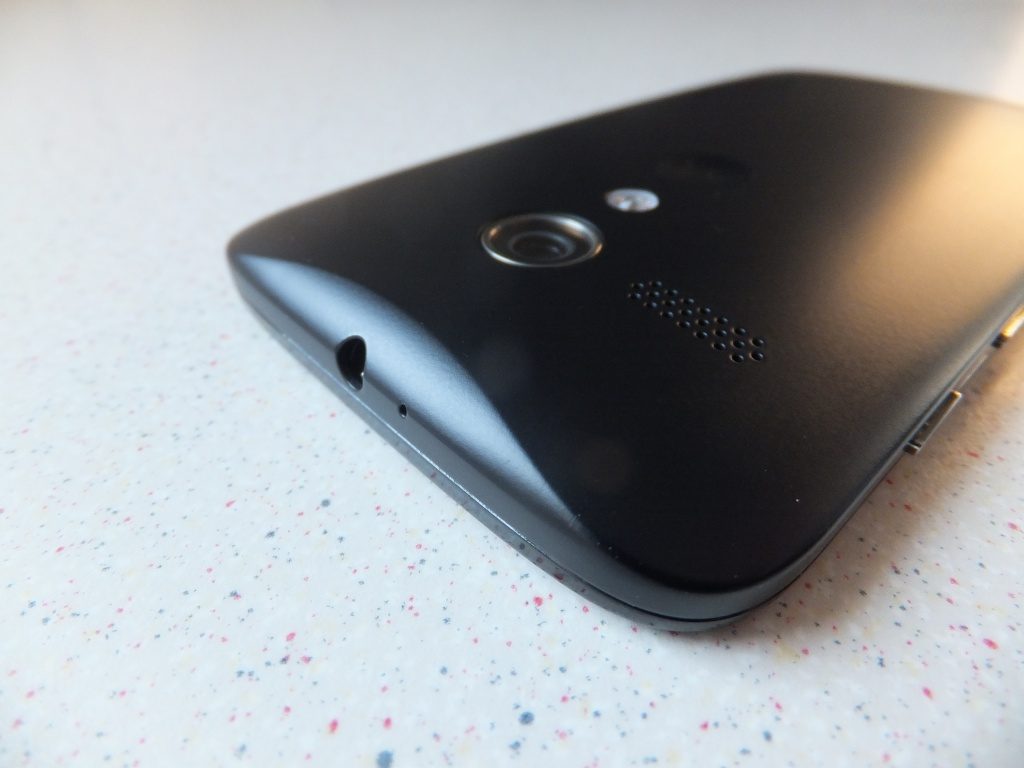 The sides of the Moto G are slightly curved along the length, the left hand side has no buttons or ports, the right hand side has the volume rocker and the power button. The bottom has the Micro USB port and a microphone hole and the top edge has the headphone socket and another (presumably noise cancelling) microphone hole.