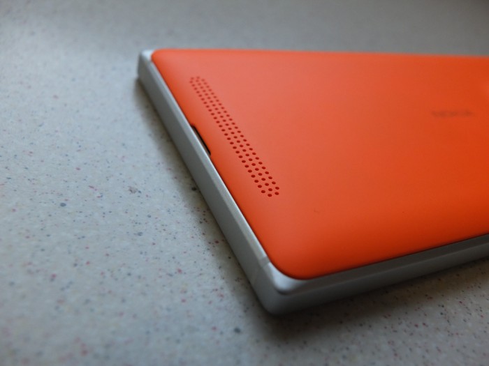 The front of the phone is pretty much standard Windows Phone layout with capacitive buttons beneath the screen, as opposed to the onscreen controls, you also get the earpiece, front facing camera and sensors at the top of the screen. The screen also bares the Nokia branding which is probably one of the last devices to come with it on. The display is slightly curved like you find on the high end Lumia, which really gives it a nice feel to use, the metal frame joins the edge of the screen with barely any gap or dust channels.